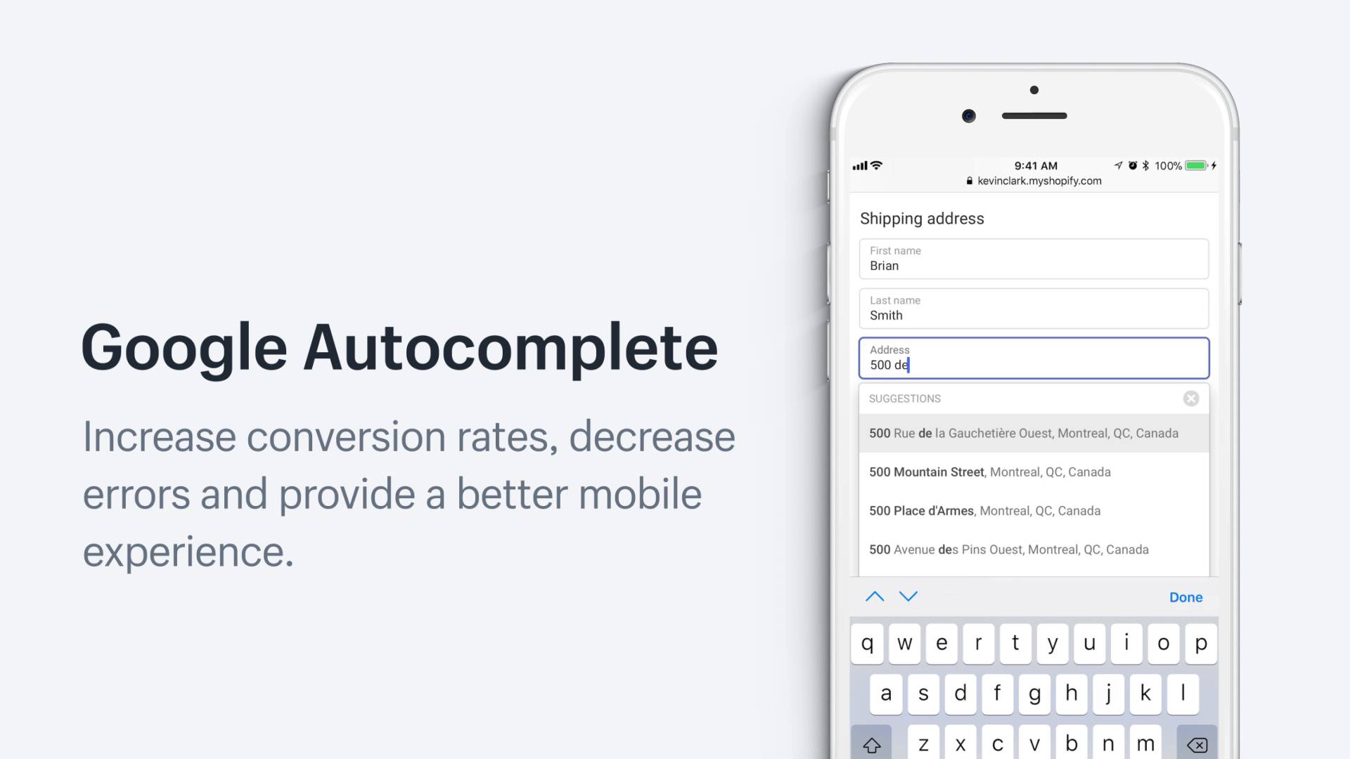 Um das Kundenerlebnis zu verbessern und dir zu helfen, höhere Conversion Rates zu erzielen, wurde Google Autocomplete auf den Checkout-Seiten von Shopify eingeführt – ohne zusätzliche Kosten. Diese Funktion wird automatisch in deinem Shop aktiviert.